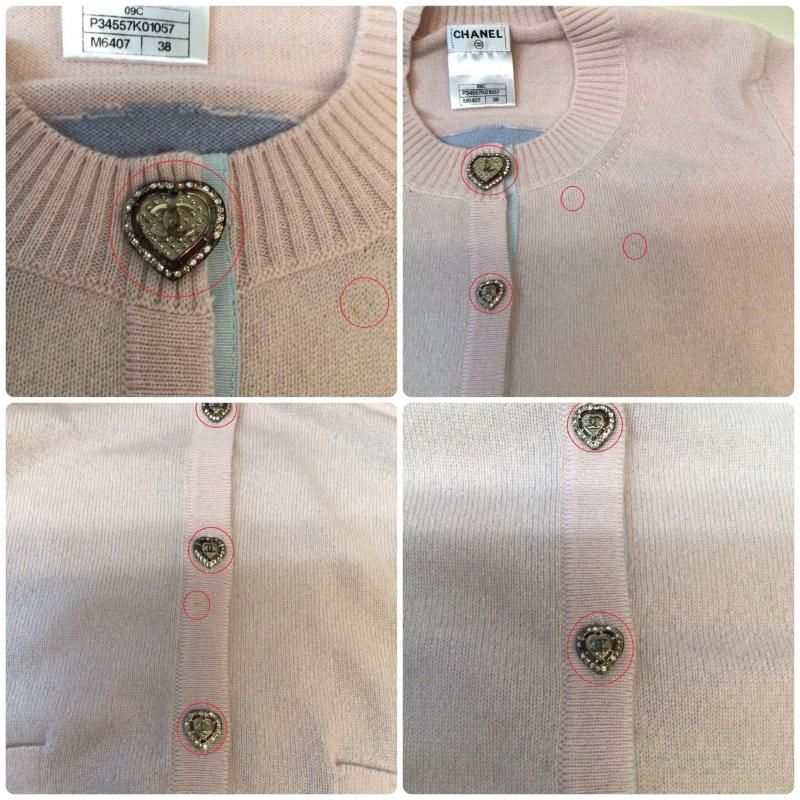 ・毛羽立ち、ストーンがとれている箇所あり、ボタン擦れ、シミあり(写真10枚目参照)